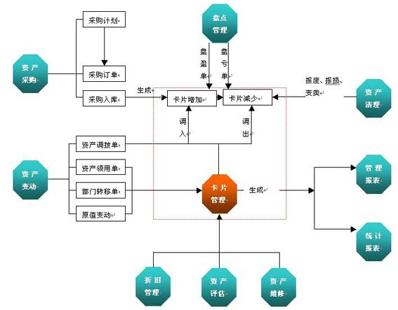 5. 资产减少:包括减少单、盘亏单、报废报损单、调出单、变卖单。单据可以直接对卡片进行减少。